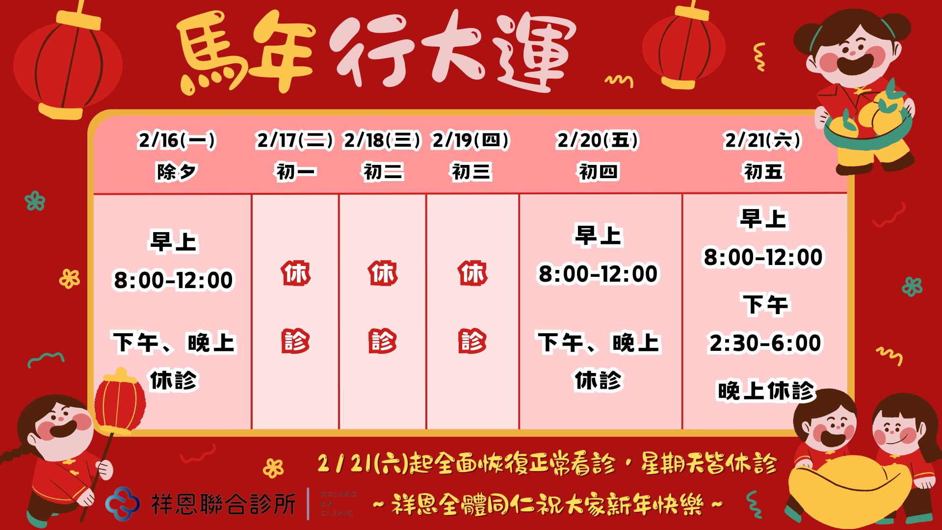 2026年春節門診時間公告